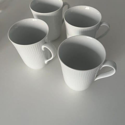 Royal Copenhagen krus og skåle i porcelæn. Sættet består af to krus med hank og to skåle.