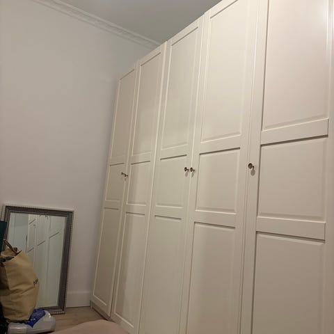 3 modulers pax skab fra IKEA med 2 mørkebrune låger i træ og en låge med spejl. Indeholder 8 kurve, 8 skuffer, 1 hylde, 1 udtræksbakke, 1 garderobestang og 3 lyspaneler. Nypris omkring 8000kr