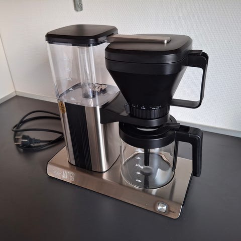 OBH Nordica Tempo Aroma kaffemaskine med glaskande og kabinet i rustfrit stål og sort plast. Maskinen har vandstandsmåler på siden og aftagelig filterholder til almindelige kaffefiltre. Egnet til brygning af filterkaffe i husholdning. Strømtilslutning med almindelig stikprop til 230V.