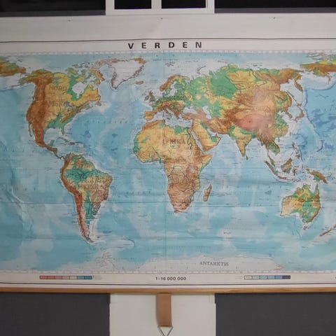 Stort verdenskort i lærred med træramme foroven og forneden. Klassisk skolekort med flotte farver og tydelig relief/terrænvisning.