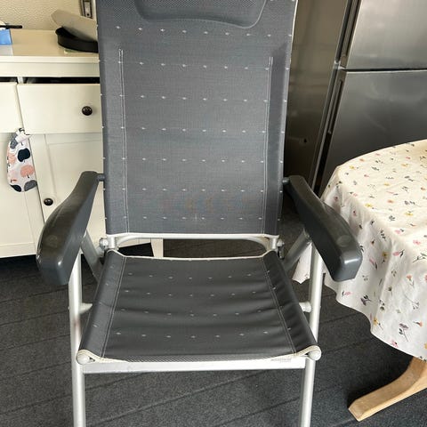 3x2 sæt af campingstole i letvægts metalstel med textilene-sæde og -ryg. Stolene har armlæn og høj ryg, som kan justeres i forskellige positioner. Flere stole i grå og blå nuancer. Velegnet til campingbrug, hvor der er behov for praktiske og sammenklappelige siddepladser. Samlet foræringshent selv pris i for allesammen Espergærde :)