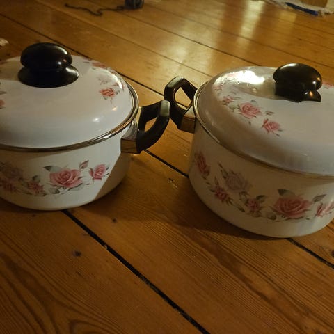 Retro Gryde i hvidt glas med farverigt grøntsagsmotiv på siderne. Tilhørende rundt glaslåg med håndtag i begge sider. Egnet til madlavning og servering. Materiale: glas. Farve: hvid med flerfarvet dekoration og klart glaslåg.
