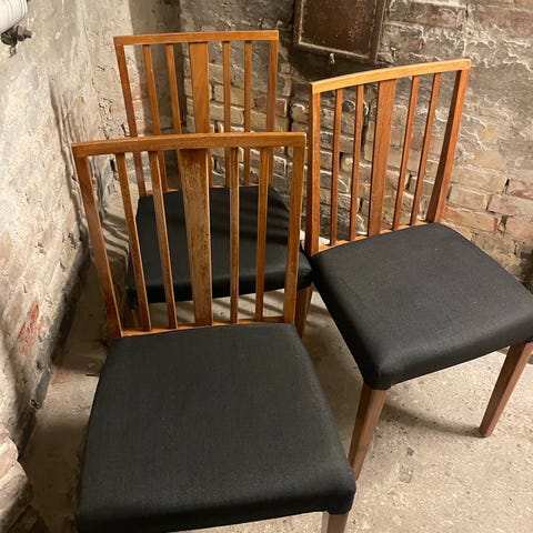 To teak spisebordsstole. Skal sættes i stand. Den ene stol skal have en gang lim og de trænger begge (især den ene) til at blive ompolstret.