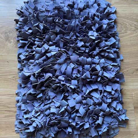 Målene er 130x92 cm, og inkl. frynserne for enderne måler det ca. 150 cm i længden.