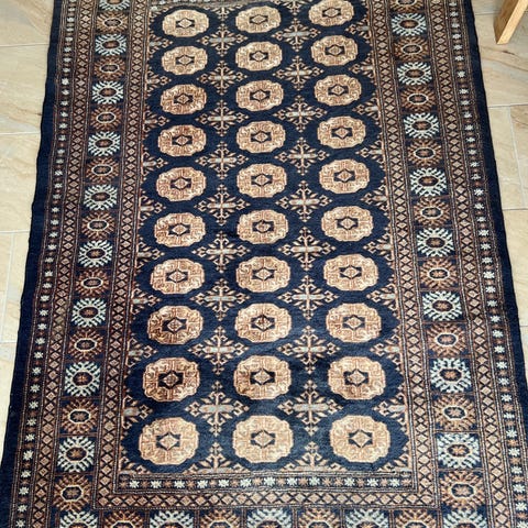 Lille gulvtæppe med orientalsk inspireret mønster i brun, creme og flerfarvede detaljer. Tæppet har en markant midterfigur og dekorativ bort hele vejen rundt. Egnet som gulvtæppe i stue, entré og andet opholdsrum.