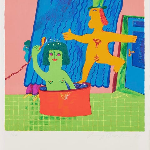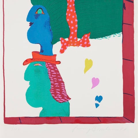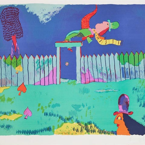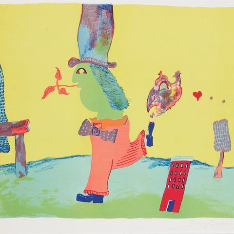 Trykket viser et fantasifuldt, farverigt motiv i kunstnerens karakteristiske stil.