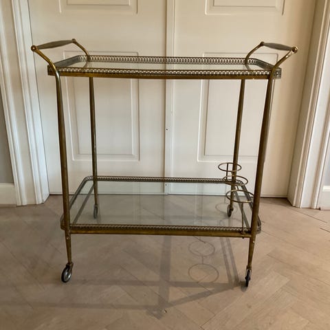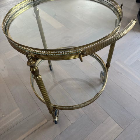 Smukt vintage barbord i messing med fine detaljer og et klassisk udtryk. Bordet har to glasplader samt en praktisk, aftagelig bakke, som gør det ideelt til servering.