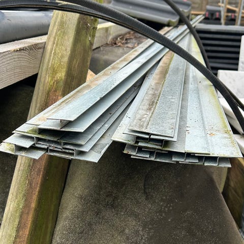 GM Bygningsprofiler metalprofiler med tilhørende beslag. Profilerne fremstår som lange metalprofiler, velegnede til bygningskonstruktioner, inddækninger eller lignende formål. Medfølgende metalbeslag er pakket enkeltvis i plastposer og er beregnet til montering og samling af profilerne. Egnet til brug i byggeprojekter, hvor der er behov for stabile og ensartede metalprofiler med matchende beslag.