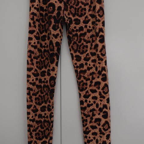 Leggings, Str. S/M, beige m/leopardmønster med sølveffekt. Pæn stand. 90% polyamid 10% elastane. Elastik i livet. Livvidde ca. 62 cm - strækkes til ca 76 cm.