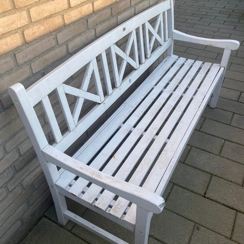 Havebænk med lyse hynder vil gerne have olie det kan medfølge