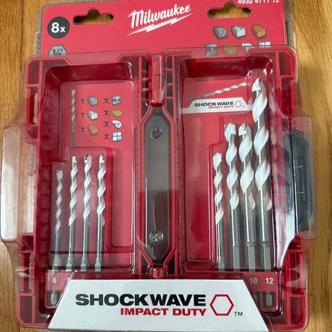 Milwaukee Shockwave bitsæt i rød plastkassette. Sættene indeholder forskellige typer og størrelser af bits samt enkelte bor, organiseret i ruminddelte bokse.