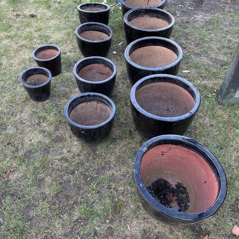 Sæt med lysegrå havekrukker i keramik/ler. Krukkerne har forskellige størrelser og former, både firkantede og runde modeller. De egner sig til udendørs brug i have, på terrasse eller altan til beplantning af buske, blomster eller mindre træer. Indersiden er brændt ler, ydersiden er lys og mat. Sælges samlet som sæt.