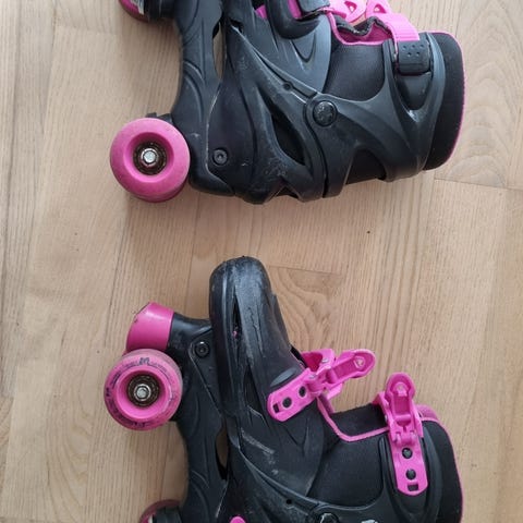 Rulleskøjter til børn i størrelse 31-34 Farven er overvejende sort med lyse detaljer. Modellen har justerbare spænder og remme for bedre pasform om foden. Rulleskøjterne har fire hjul på række og er velegnede til almindelig rulleskøjteløb for børn i den angivne skostørrelse.