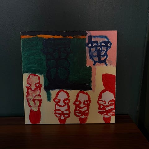 Abstrakt maleri med integreret lysfunktion, der skifter farve og fremhæver forskellige mønstre og detaljer i værket. Maleriet består af flere sektioner med levende farver som rød, blå, pink og grøn, der ændrer sig ved brug af lys. Velegnet til dekorativ brug i hjem eller kontor, hvor visuel effekt og stemningsbelysning ønskes.