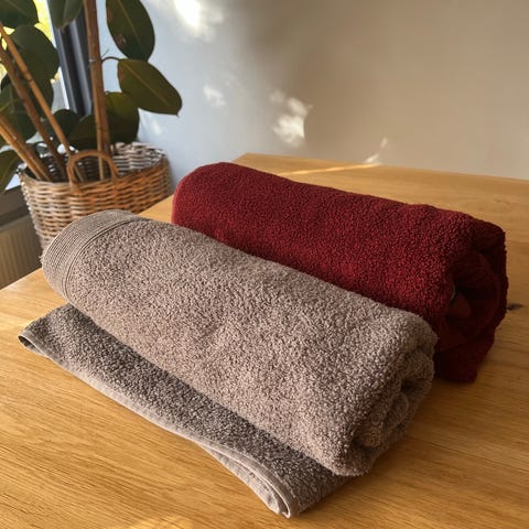 Sættet består af 12 brune håndklæder i tre forskellige størrelser. Materialet fremstår som blødt frotté, velegnet til badeværelse, gæstehåndklæder eller daglig brug i hjemmet.