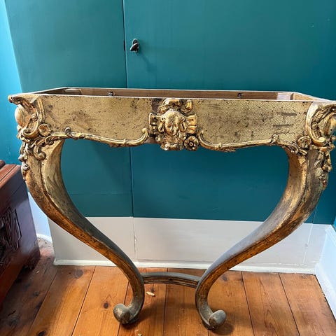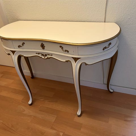 Konsolbord og spejl i sæt. Konsolbordet har halvrund bordplade i grøn nuance med dekorationer og understel i guldlook med drejede ben og udskårne detaljer. Spejlet er rektangulært med ramme i guldlook og grøn top med relieffer. Sættet er egnet til entré, gang eller stue som dekorativ indretningsdetalje.