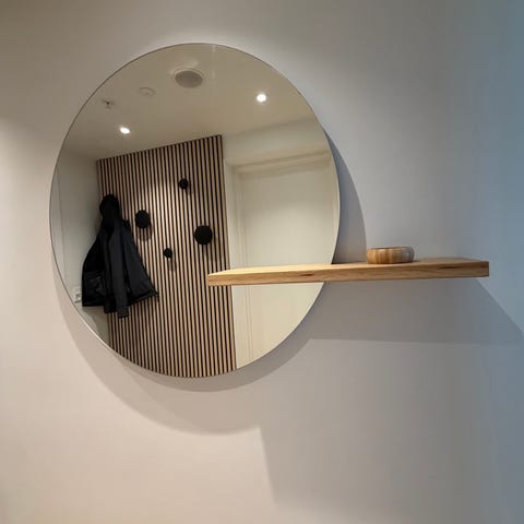Bolia rundt vægspejl med integreret hylde. Sælges grundet flytning. Spejlet er cirkelformet og monteres på væg, med en vandret hylde i træ under gennem spejlet, som kan bruges til opbevaring eller dekoration. Velegnet til entré, stue eller soveværelse som både spejl og funktionel afsætningsplads.