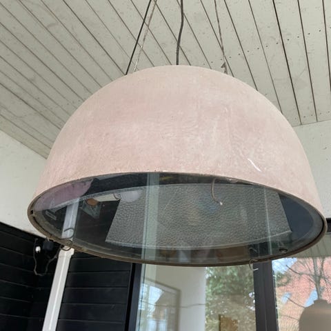 Den hænger pt udenfor på overdækket terrasse. Kan også benyttes indenfor. Har tidligere været benyttet som spisebordslampe.