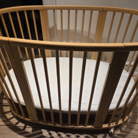 Vi har brugt den både som bedside og senere som fritstående. I mellemtiden forsvandt hjul og et par skruer. Vi købte nye skruer (2 stk) men hjulene skal man selv købe, hvis man vil have dem på. Den sælges sammen med en rigtig god allergivenlig og varmeregulerende kapok madras fra Cocoon (nypris: 1500 kr.) Den har en lille skjolde (se billede) men har ellers været brugt med vådliggerlagen altid. Der medfølger et Cocoon lagen med de rigtige mål. Man kan også få en Stokke V2 madras (nypris 1200 kr.) med i købet, som vi aldrig fik brugt da betrækket ved en fejl blev vasket med duft skyllemiddel. Men den er jo god at have som reserve.