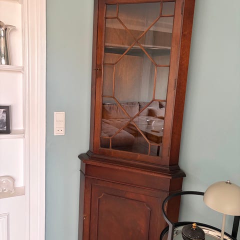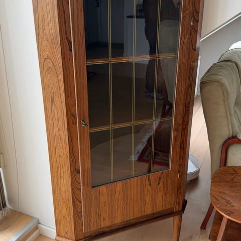 Vitrineskab i hjørnemodel udført i træ med glaslåge. Skabet har øverste del med glaspartier og sprosser, velegnet til opbevaring og udstilling af service, glas eller pyntegenstande. Nederste del fremstår som lukket skabssektion til skjult opbevaring. Klassisk design, egnet til placering i hjørne af stue, spisestue eller køkkenalrum.