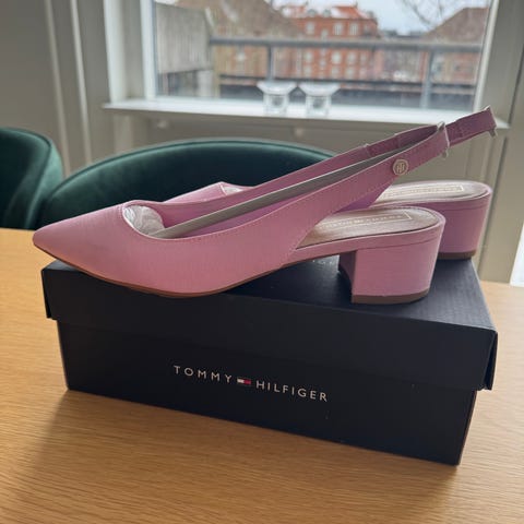Tommy Hilfiger festsko i størrelse 38. Skoene er i en gul farve med slingback-rem og lav blokhæl. Spidse snuder og lukket front. Velegnet som pæne sko til festlige anledninger eller hverdag, hvor der ønskes en mere formel sko. Leveres i original æske, hvis ønsket.