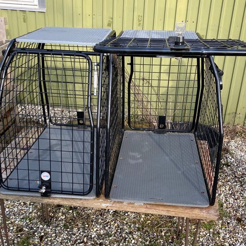 Artfex hundebur i metal med skrå sider, velegnet til montering i bilens bagagerum. Buret er udført i sortlakeret metalgitter med solid låsemekanisme på døren foran. Indvendigt medfølger en brun polstret pude, som giver hunden et blødt liggeunderlag. Egnet til transport og sikker fastspænding af hund under kørsel eller som fast hvileplads i bilen eller hjemmet.