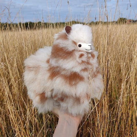 Lækker håndlavet alpaca bamse. Fremstillet af ægte alpaka uld og håndlavet i Peru - købt direkte fra Inkari Alpaca i Holland. Den måler 23 cm og er en størrelse "small". Denne alpaka er en limited edition i farven "forest raindeer", og den kommer med certifikat samt originalt mærke om halsen.