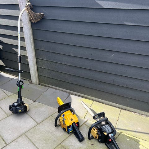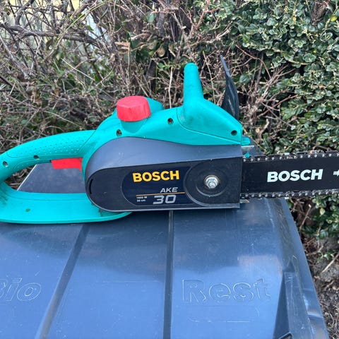 Scheppach benzinkædesav i rød og sort. Kædesaven har for- og baghåndtag samt kædeskinne med kæde monteret. Velegnet til almindeligt skov- og havearbejde som opskæring af brænde og beskæring af træer.