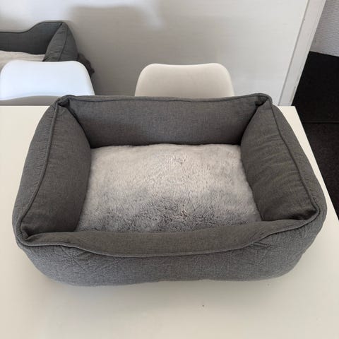 Hundeseng i rektangulær form med mål på ca. 58 x 75 cm. Yderside i grå farve og blød, lys liggeflade. Sengen har høj kant hele vejen rundt og skridsikker bund, der hjælper med at holde den på plads på glatte gulve. Betrækket er vaskbart, hvilket gør den nem at holde ren. Velegnet til mindre og mellemstore hunde afhængigt af race og størrelse.