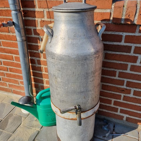 Gl metal kar, der har været brugt som regnvands tønde og trænger til en rengøring