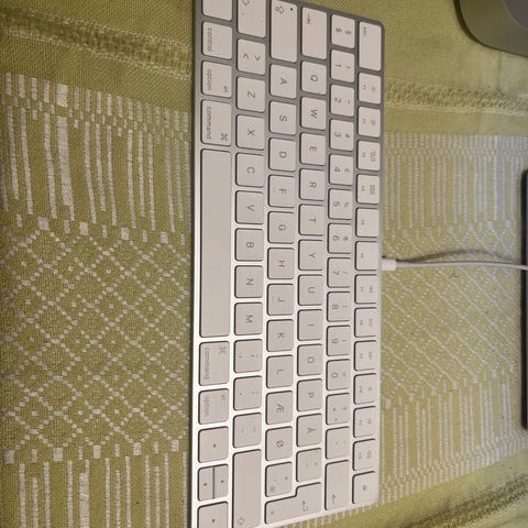 Trådløst tastatur i kompakt layout med lavprofiltaster. Tastaturet har dansk tastaturlayout med funktionstaster i øverste række. Leveres med original emballage og opladningskabel efter billederne. Egnet til brug med kompatible Apple-enheder, f.eks. Mac og iPad, afhængigt af systemkrav og tilslutningsmuligheder.