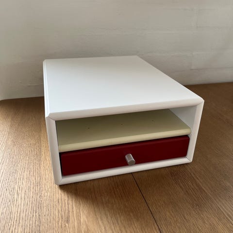 Det fineste skrivebordsmodul i farven New White samt viste farver..med plads til alt det man ikke vil ha liggende fremme. Det åbne rum er med hul til stik til mobil, IPad, powerbank eller lign. man ønsker at oplade… modulet kan bruges som konsol til pc-skærm eller bare stå og pynte på skrivebordet… er også pænt set fra bagsiden, hvis man har et skrivebord ud i rummet.. mål : 69,5x30x12,5 cm. Så kan også stå ovenpå eller mellem andre Montana moduler i 69,5x30 cm