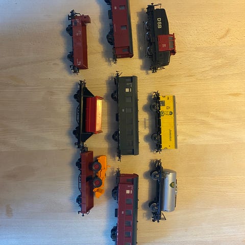Samling af Märklin sæt, bestående af transfomator, det mindre lokomotiv, diverse vogne (Shell, Esso ladvogne) skinner (Buede og lige) samt en stop skinne sælges samlet. Brugt, men fungerer fint. Samlet pris kr. 500
