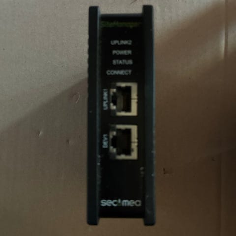 Secomea SiteManager 1029 router. Industriel netværksenhed med to Ethernet-porte (uplink og dev) på fronten samt seriel port og klemrække til strømtilslutning på siden. Enheden er beregnet til netværksforbindelse og fjernadgang i industrielle eller tekniske installationer. Fremstillet i Danmark af Secomea A/S.