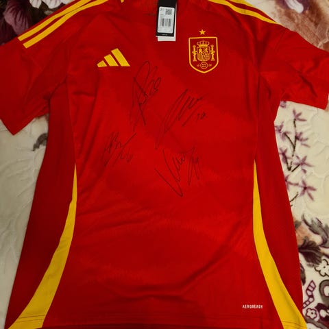 Spanien trøje med underskrift af: Olmo, Pedri, López, og Bonmatí