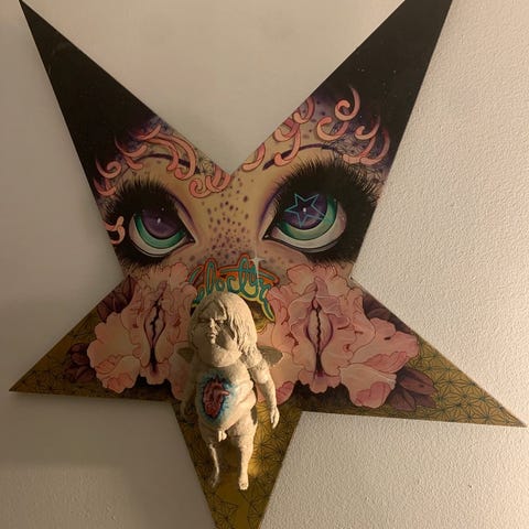 Blandede medier, Coco Electra , b: 40 h: 64, helt unik og meget smuk figur af danske anerkendte kunstner Coco Electra. Udskåret af pap og bemalet. (deraf rustik ujævn finish del af værket) one of a kind, originalt værk. måler 64 cm i højden.