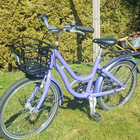 Kildemoes Retro Bikerz børnecykel med 20" hjul. Cyklen har lav indstigning og lige styr. Farven er lilla, og modellen er udstyret med bagagebærer og kurv foran. Sædet er sort, og cyklen har kædeskærm og skærme over hjulene. Velegnet som hverdagscykel til børn i den størrelse, der passer til 20" hjul.