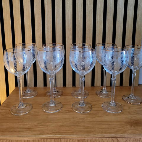 10 smukke vintageglas: 5 vinglas og 5 dessertvinglas i krystal. Med flotte slebne detaljer til smuk borddækning. Ingen skår. Skal væk pga. pladsmangel.