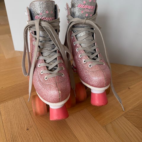 Supreme Turbo 33 rulleskøjter i børnestørrelse 35-38. Klassiske side-by-side rulleskøjter med sort støvle og snørelukning. Hård ydre støvle med polstret skaft for støtte omkring anklen. Monteret med fire hjul pr. skøjte i lilla farve samt bremseklods foran. Velegnet til børn med skostørrelse 35 - 38 til brug på glatte, jævne underlag som fx indendørs gulve eller asfalt.