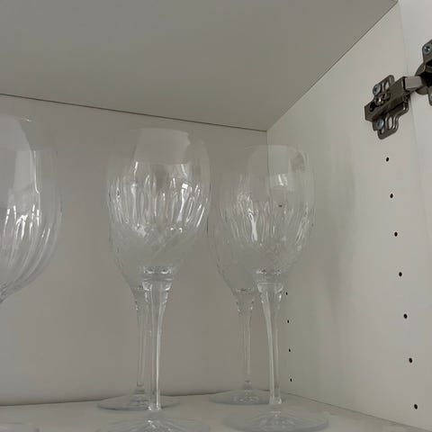 4 stk. fine og lette hvidvinsglas fra Luigi Bormioli. Fremstår en anelse støvede på billede, da de har stået ubrugte længe, og solen er lidt utaknemlig desangående. Men standen på glassene er rigtig god.