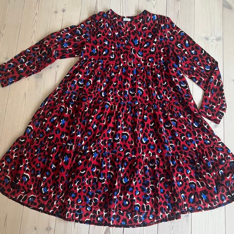 Kjole med et levende leopardprint i gule, sorte og lyserøde nuancer. Kjolen har en krave, gennemgående knaplukning foran og lange ærmer med manchetter. Skørtet er designet med flæser, der giver et legende fald og en løs pasform.