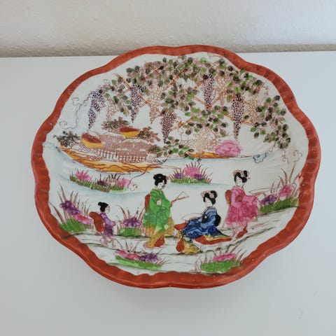 Kinesisk skål. Diameter ca. 22 cm. Højde ca. 5,5 cm. Ingen skår eller revner. Har også tekande/kaffekande - se anden annonce.