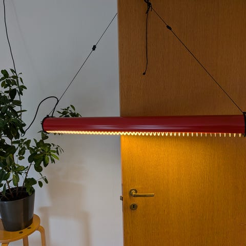 Lyfa Tone pendel, designet af Bent Karlby i rød med kæder til ophæng.