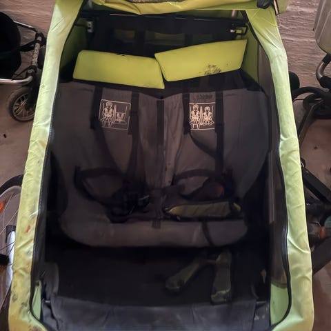 Thule agtig klapvogn/cykeltrailer med tre hjul. Modellen har stort forhjul til løb eller gåture og to baghjul. Kabinen er lukket med net- og plastfront samt sidestykker, der beskytter mod vind og vejr. Der er polstret skubbehåndtag og opbevaringskurv bagtil. Indvendigt er der plads til barn/børn med sele og tekstilindtræk. Velegnet som kombineret løbevogn og cykeltrailer, når den bruges med passende trækstang og cykelkobling.