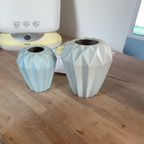 vaser i hvidt materiale med dekorative blomsterdetaljer og guldfarvet kant. Sættet består af to ens vaser med let bølget kant foroven og reliefmønster med blomster på forsiden. Velegnet til brug som blomster- eller pyntevaser i stue, køkken eller andre rum i hjemmet.