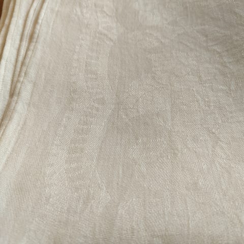 Smuk hørdug i fin, cremehvid kvalitet og med smukt og farvestrålende petit point i motiv af blomsterkrans.