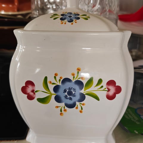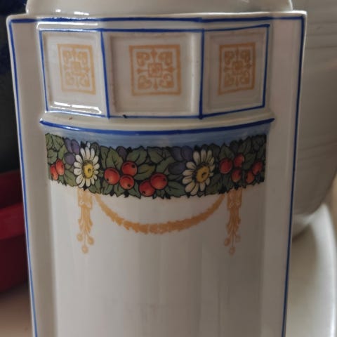 Porcelæn krukke med låg hvid med blomstermotiv og guldkant