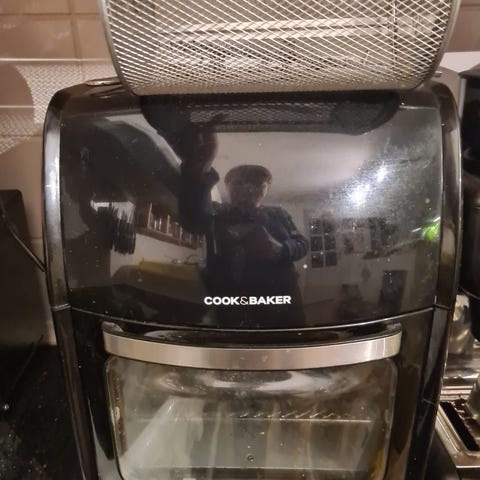Cook & Baker airfryer i sort. Enheden har frontlåge med vindue og aftagelige riste og bakker, som kan bruges til tilberedning af forskellige typer mad. Medfølgende tilbehør omfatter blandt andet roterende kurv, riste og tang, som kan anvendes til fx grillkylling og andre retter, der kræver cirkulerende varm luft. Indersiden har metalrist og drypbakke i bunden for opsamling af fedt og madrester. Velegnet til tilberedning af mad med varmluftsfunktion i køkkenet.