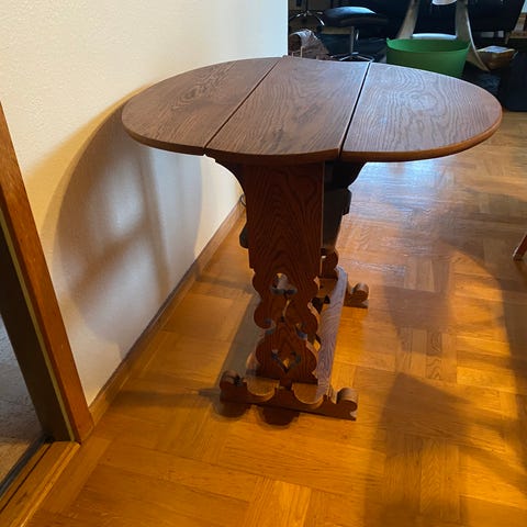 Klapbord i træ med oval bordplade og udskårne ben. Bordet har to klap-sider, så det kan bruges både som lille konsolbord og som mindre spise- eller sidebord, afhængigt af om klapperne er slået op eller ned. Overfladen fremstår i brun træfinish med synlig årestruktur. Velegnet som ekstra bord i stue, entré eller mindre rum, hvor der er behov for fleksibel bordplads.