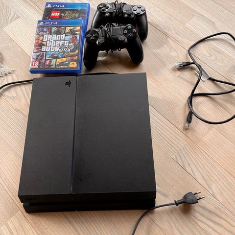Medfølger: diverse stik, 2 orginale somy ps4 controllere. Trådløs Oplader, 3 Spil som ses på billedet.